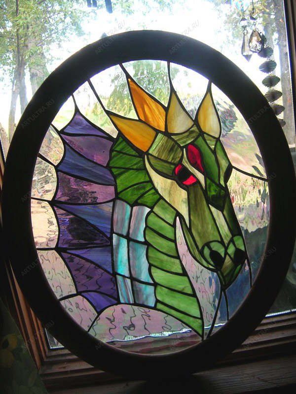 Витраж на стекле «Дракон» изготовлен при помощи популярной техники Тиффани, которая позволяет создавать качественные и эффектные изображения. В работе был использован 71 стеклянный фрагмент зарекомендовавшей свое имя марки Spectrum. Данная работа считается средней степени сложности, однако, несмотря на это, выполняется она достаточно быстро (всего за одну неделю). Витраж на стекле «Дракон» привнесет в ваш интерьер особый характер, создав атмосферу надежности и уверенности в своих силах. Кроме этого, он за счет своих магических возможностей будет способствовать оберегу как жилища, так и самих хозяев. Гарантия на такое изделие составляет 12 лет, но при бережном уходе витражная композиция не потеряет своего первозданного внешнего вида на протяжении гораздо большего времени.
