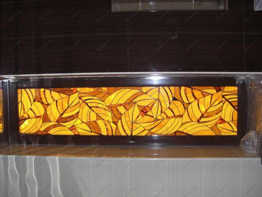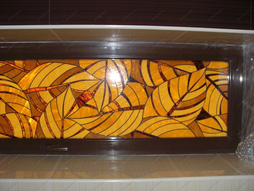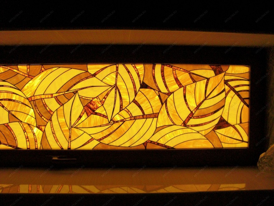 Витраж “Осенние листья” выполнен в стиле арт-деко и служит украшением окна в бассейне. Этот стиль зародился в начале 20-го века и объединил в себе модерн и неоклассицизм. Для арт-деко характерен сложный рисунок с повторяющимися деталями ярких цветов. На нашем витраже это ярко-желтые листья деревьев. Данное изделие не может быть не замечено, оно выглядит монументально и помпезно. Несомненно, витраж - главная фигура в дизайнерском решении украшения бассейна, он притягивает взгляд ярким цветом и гармонично вписан в окружающий интерьер.