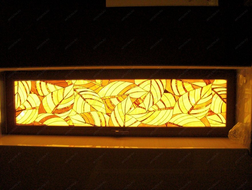 Витраж “Осенние листья” выполнен при помощи пленочной техники. Он создается на цельном листе стекла. На стекло наклеиваются куски специальной самоклеящейся витражной пленки. Чтобы придать витражу натуральный вид, на стыках пленки наклеивают свинцовую ленту. Внешне изделие выглядит, как витраж, выполненный в технике Тиффани, но стоимость его намного меньше. Такие варианты доступны по цене для многих простых покупателей. Они являются высокохудожественной имитацией витражей, сделанных при помощи классической техники.