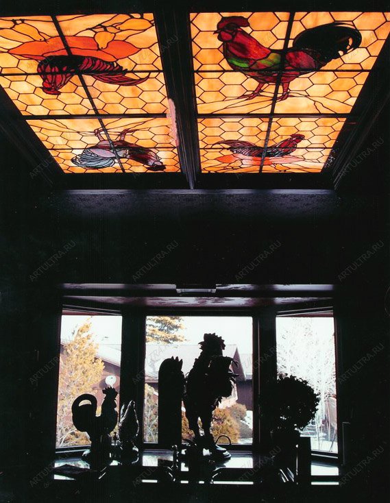 Витраж “Петух” отличает натуральность, простота и естественность. Вычурность и роскошь заменены в нем мягкостью, романтичностью, теплотой и близостью к природе. Он навевает мысли о тепле, уюте, комфорте, вызывает ностальгию о детстве. Кроме того, этот витраж помогает улучшить настроение и настраивает на интересное времяпрепровождение в кругу семьи, в компании близких друзей и знакомых. Он прекрасно подойдет для загородного дома, дачи или коттеджа. В витраже использованы только природные цвета – песочный, бежевый, красный и зеленый. Все цвета довольно приглушенные, как того требует стиль кантри. Этот потолочный пейзаж, пропуская свет, делает его менее ярким, зато более теплым и щадящим. Этот витраж просто великолепен в своей наивной, может быть, немного грубоватой деревенской простоте.