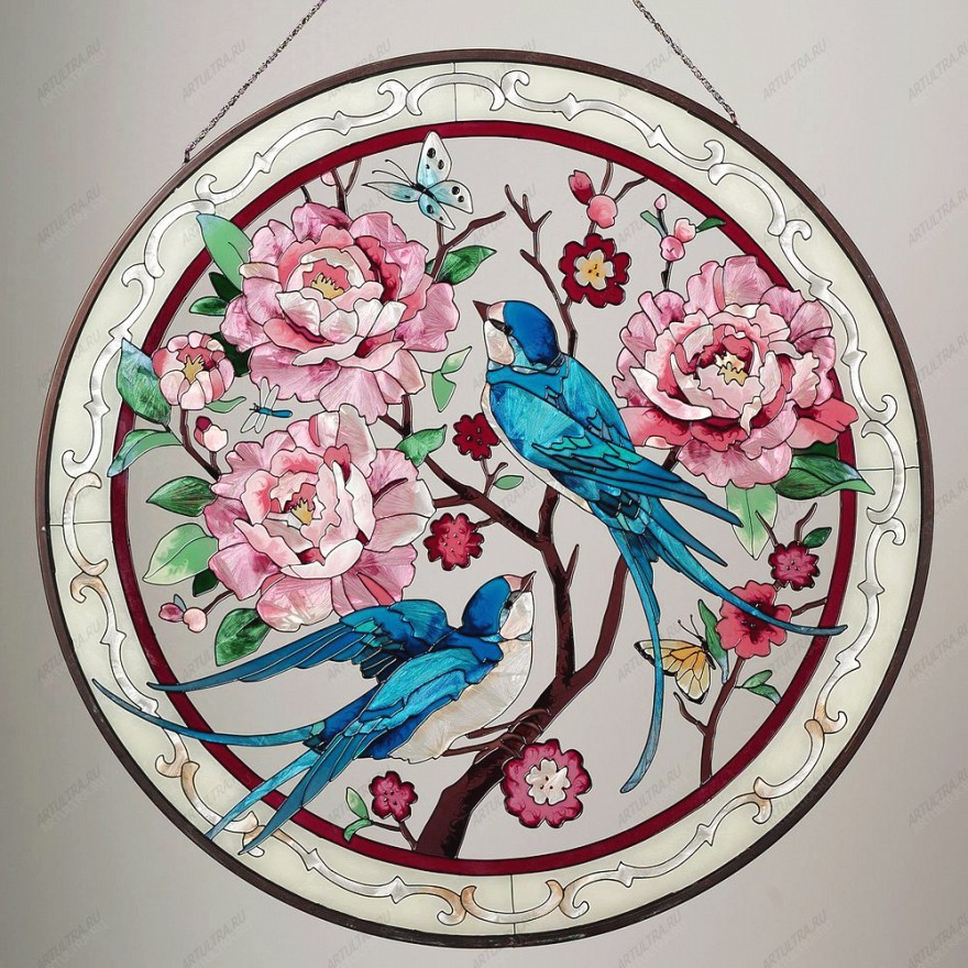 Розовые пионы являются особенными цветами. Они одни из немногих, несущих мужскую энергию Ян, именно ту, которая работает подобно магниту, наполняя жизнь и пространство вокруг человека. Витраж «Пионы» словно магнит начнет притягивать в вашу жизнь мужчин, причем не любых, а именно тех, с которыми можно будет надеть свадебное платье. Фэн-шуй трактует розовые пионы, как олицетворение не угасающей любви и пылкой страсти, рекомендуя размещать такие картины. Изображенные на витражной картине ласточки будут вселять в вас надежду, т.к. они символизируют удачу и благополучие. Кроме этого, ласточка – очень светлый символ, она также олицетворяет весну, счастье, новую жизнь, восход солнца, возрождение и надежду.
