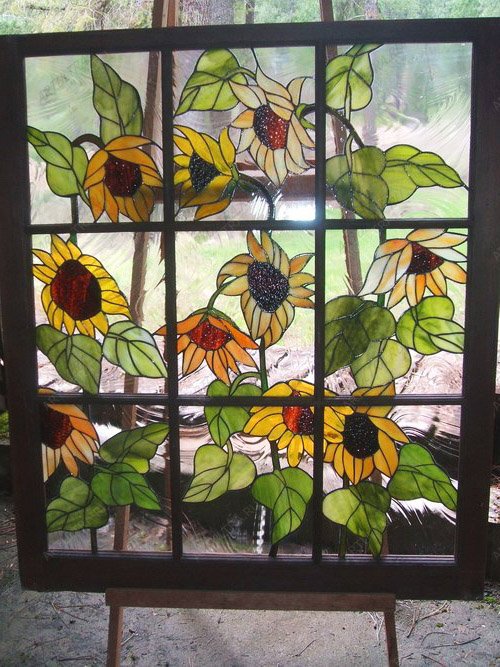 Этот витраж будет прекрасно выглядеть в оформлении кухонного окна. В последнее время подсолнухи очень популярны в создании интерьеров. Их изображения можно увидеть на посуде, керамической плитке, шторах и других элементах декора.