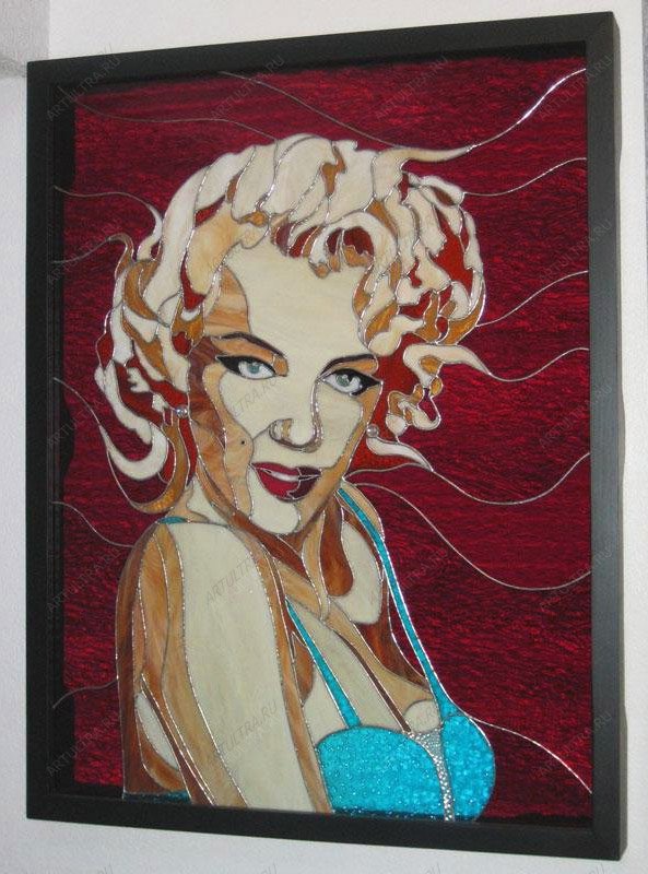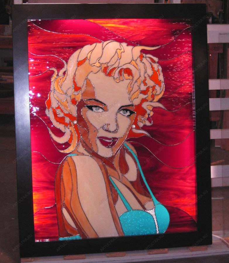 Витражный портрет незабвенной Мэрилин Монро выполнен в духе Энди Урхола. Как известно, именно ему принадлежит тот самый поп-арт с великой актрисой и певицей. Самая красивая женщина прошлого столетия на этой картине выглядит очень реалистично и живо. Такого эффекта позволила добиться известная среди мастеров витража техника Тиффани. Сто пятьдесят шесть деталей были соединены особой технологией пайки, а медная лента выступила в качестве дополнительного декора и несущего элемента. Картина выполнена в стиле модерн, который гармонично вписывается в любой интерьер, мягко дополняя его.