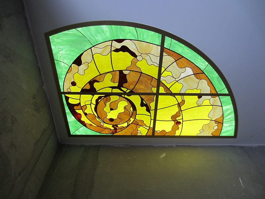 Витраж «Ракушки» за счет своего уникального дизайна преобразит любую комнату в лучшую сторону. Янтарно-желтые переливы основного цвета и нежно-оливковый фон играют фантастическими оттенками, наполняя комнату волшебным сиянием. Такого эффекта позволила добиться техника Тиффани, которая использовалась при создании витража. Почти сто крупных, ограненных стеклорезом элементов, соединились в одну композицию при помощи надежной пайки, а медная лента выступила в качестве упрочняющего элемента. Если установить такой витраж на потолок, то любая комната станет по-новому красивой и праздничной.