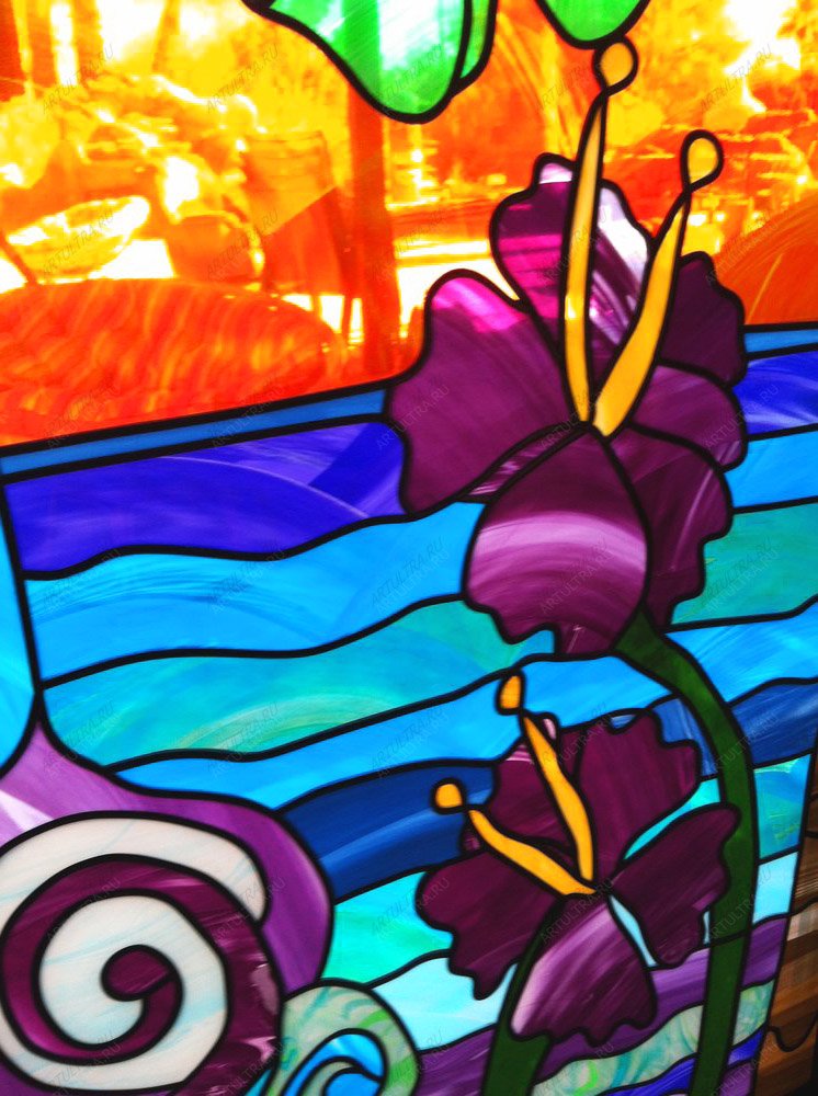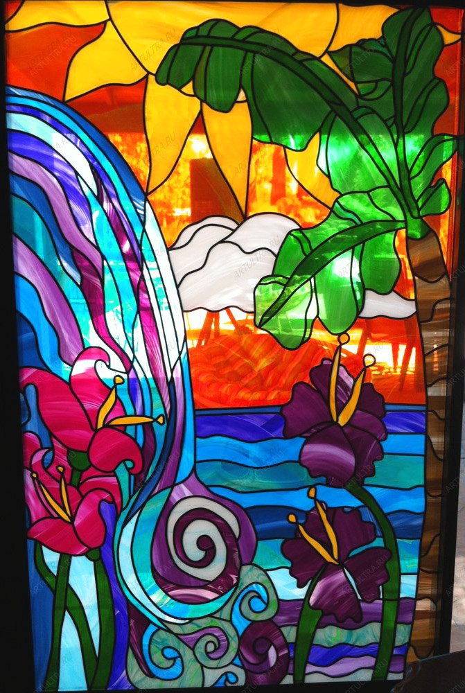 Витраж «Райский сад» станет эффектным и очень красочным украшением дизайна вашего интерьера. С его помощью можно оригинально оформить окно или же раздвижную дверь для придания им большей яркости и выразительности. Выполнен такой витраж в стиле «пейзажи в интерьере».