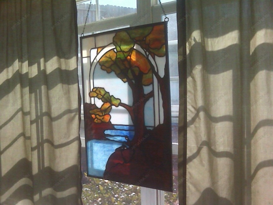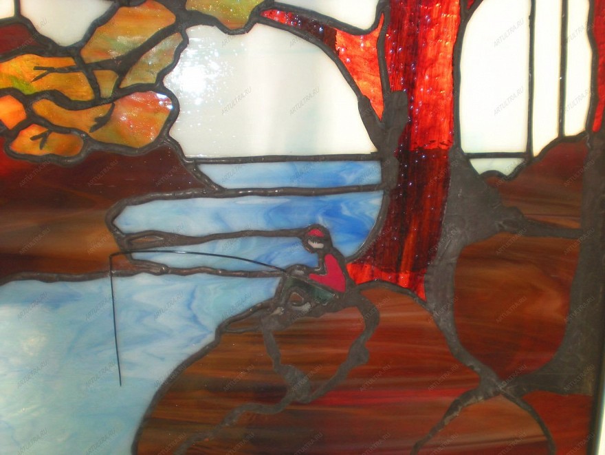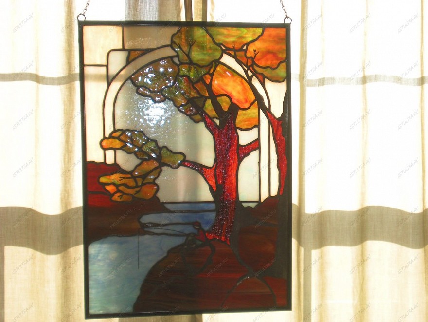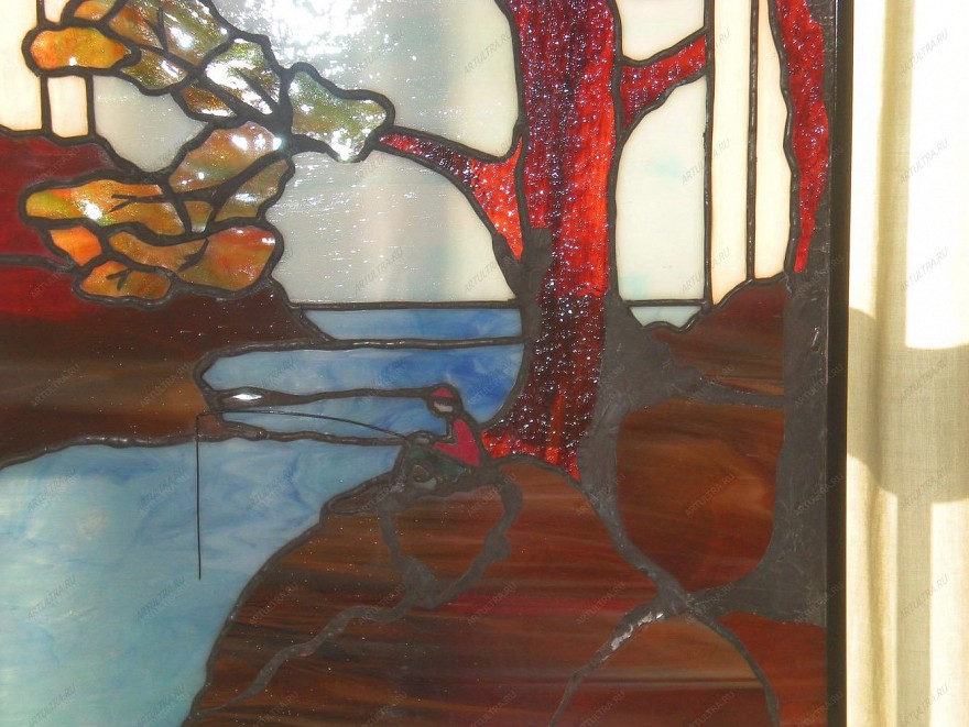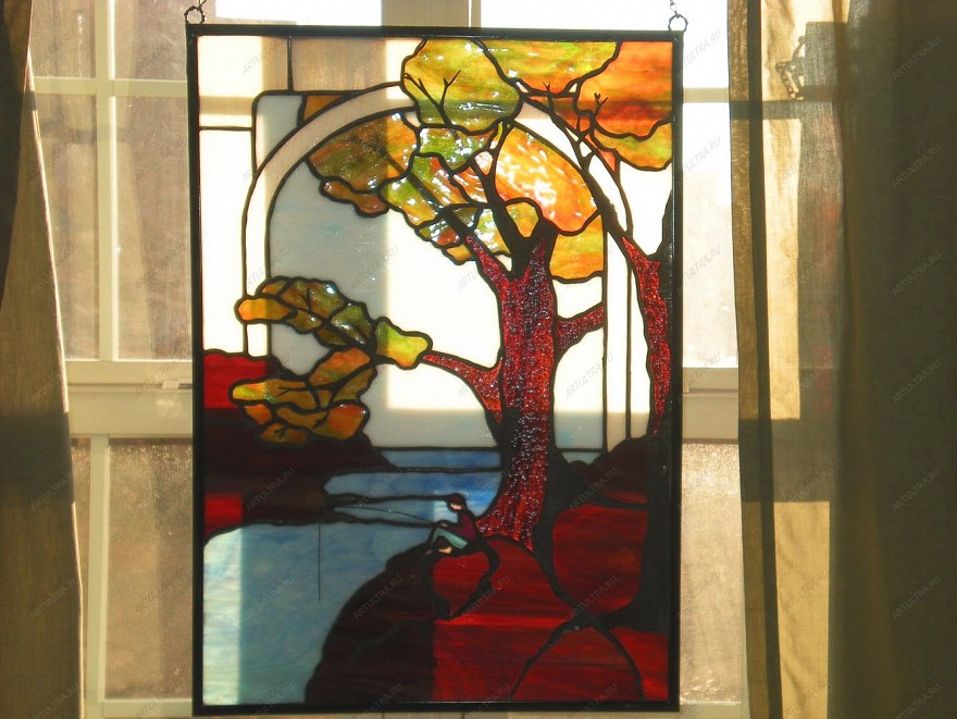 Витраж «Река» украсит кухню, ванную, спальню или гостиную. Уход за ним не требует специальных средств и каких-либо ухищрений. Необходимо лишь протирать его от пыли по мере загрязнения обычным моющим средством для стекла. Главное - избегать составов, которые содержат кислоту и абразивы. Безмятежный осенний пейзаж на фоне реки создаст в вашем доме неповторимую добрую и теплую обстановку, которая останется с вами навсегда.