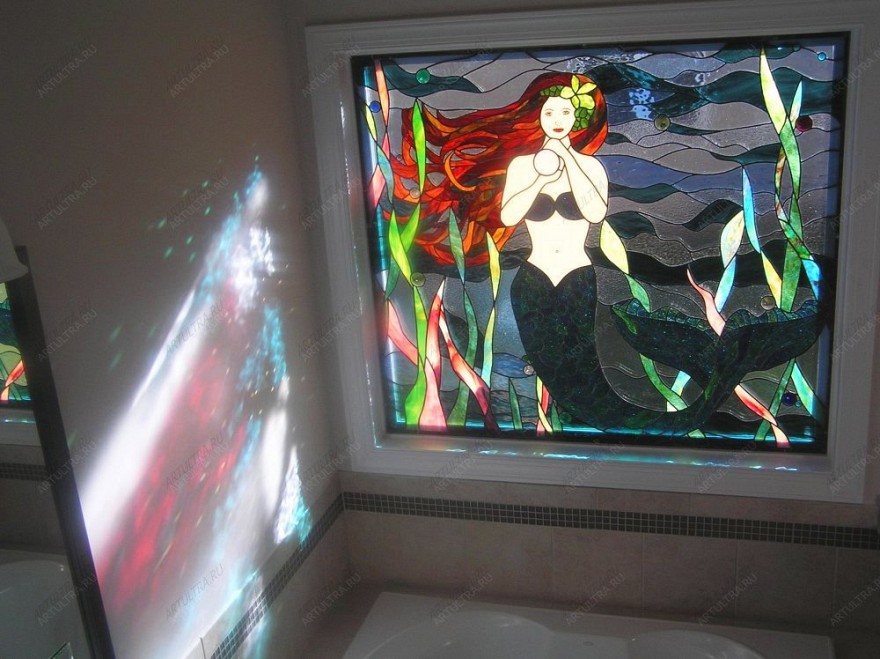 Витраж «Русалка» не требует особого ухода и специальных составов. Моется он как обычное окно, при этом рекомендуется не применять средства с растворителями и твердыми частицами. Производитель предоставляет гарантию на изделие сроком 12 лет, но обычно такие окна служат гораздо дольше. При солнечных лучах витраж наполняется мистическим сиянием, а русалка словно оживает. Поселите в своем доме сказку, украсив его таким витражом.