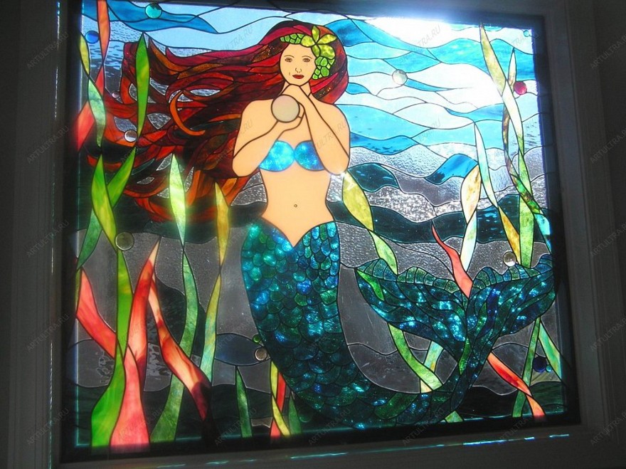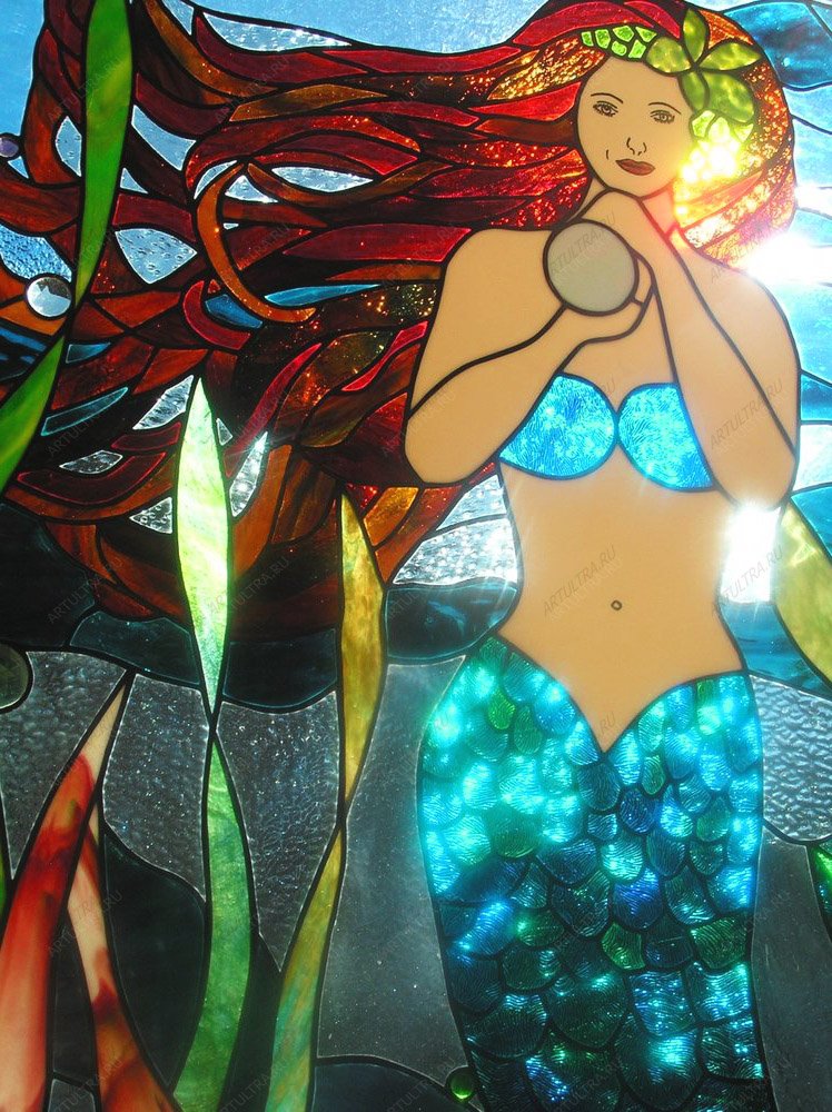 Витраж «Русалка» придаст вашему дому атмосферу сказок Андерсена и станет напоминанием о настоящей верной любви. Такое окно – отличный вариант разнообразить интерьер, прибавив лишь одну на первый взгляд незначительную деталь. Техника Тиффани, которая использовалась при создании рисунка, наделила его реалистичностью и стереоэффектом, а также добавила ему атмосферу волшебства. Сто шестьдесят восемь деталей были спаяны надежным припоем из свинца и олова, а лента из меди органично вписалась в общую картину, попутно придав ей прочности. Получившиеся в итоге фантастические переливы цвета заставляют смотреть на картину бесконечно.