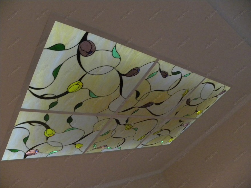 Витраж с цветами – замечательный современный потолочный витраж, являющийся отличной альтернативой надоевшим и привычным люстрам. Нередко таким образом маскируются различные недостатки и дефекты потолочного покрытия или скрываются коммуникации, при этом сохранив к ним доступ.