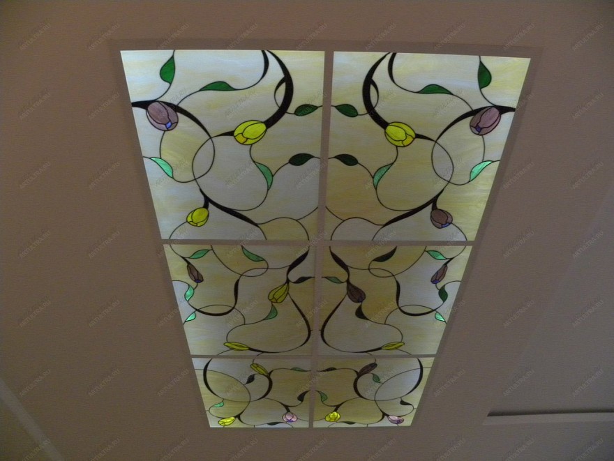 Витраж с цветами – современный и очень популярный вид потолочного декора для украшения и дополнения вашего домашнего интерьера. Рисунок потолочного витража, представленный на фото, очень незатейлив и деликатен, что позволит ему органично влиться в любой дизайн.
