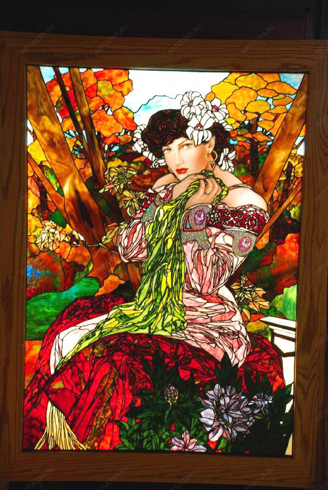 Витраж с девушкой изготовлен по сравнительно молодой технике заливного витража с использованием акриловых красок. Их особенностью является то, что они не требуют обжига, т.к. твердеют самостоятельно в результате химических реакций. Контуры рисунка наносятся вручную или с помощью специального оборудования. После этого пространство между контурами заливается красками необходимых оттенков. В работе используются высококачественные материалы и краски, не выделяющие вредных веществ, что делает их абсолютно безопасными для здоровья.