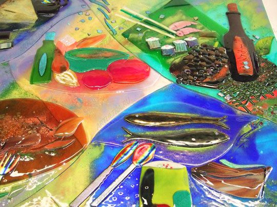 Уход за витражом с фьюзингом самый простой: его можно мыть порошком или средствами для снятия жира, так как закаленное толстое стекло практически невозможно повредить. Картина прекрасно сочетается с любым убранством кухни, так как выполнена в универсальном классическом стиле, поэтому она легко интегрируется в любую обстановку. Витражи с фьюзингом сейчас на пике популярности, поэтому украшая свой дом таким образом, вы делаете его не только красивым и уютным, но еще и модным.