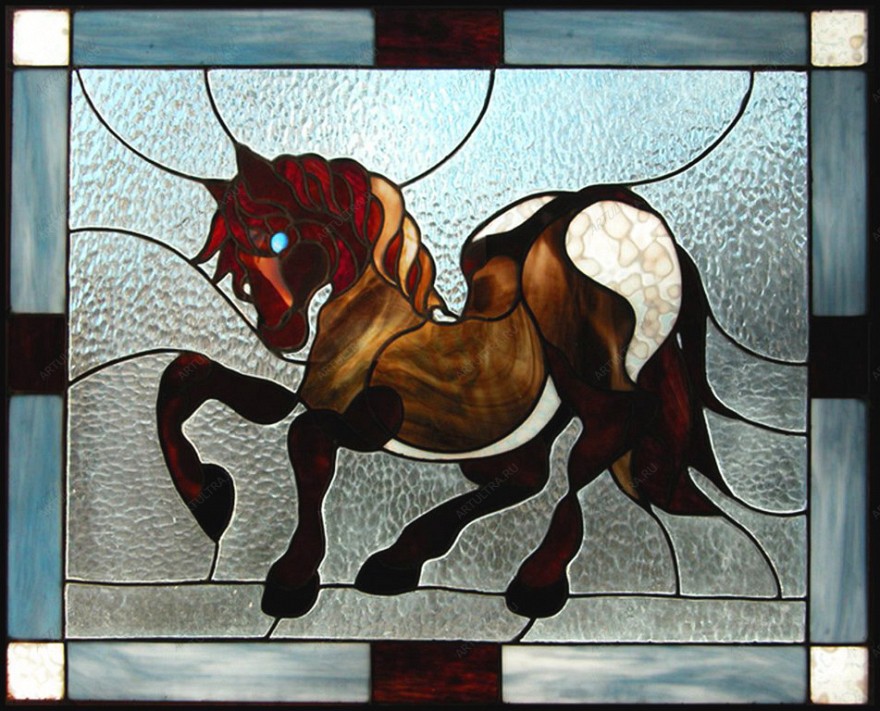 Витраж с лошадью – оригинальный и довольно эффектный вариант оформления обычного неприметного окна. Подобным образом можно декорировать окно в любой комнате в зависимости от ваших пожеланий и дизайна интерьера. Лошадь олицетворяет грацию, вожделение и скорость, но вместе с этим символизирует и мужество. В христианском искусстве лошадь стала эмблемой благородства. Примечательно, что скачущая лошадь символизирует о подходящем жизненном моменте, когда судьба предоставляет особый шанс. В связи с этим, приобретение данного необычного витража было бы очень актуально и к месту тем, кто ожидает каких-то счастливых перемен. Витражом с лошадью можно украсить интерьер кабинета, детской или любой другой комнаты, где хочется создать стильную и незаурядную обстановку.