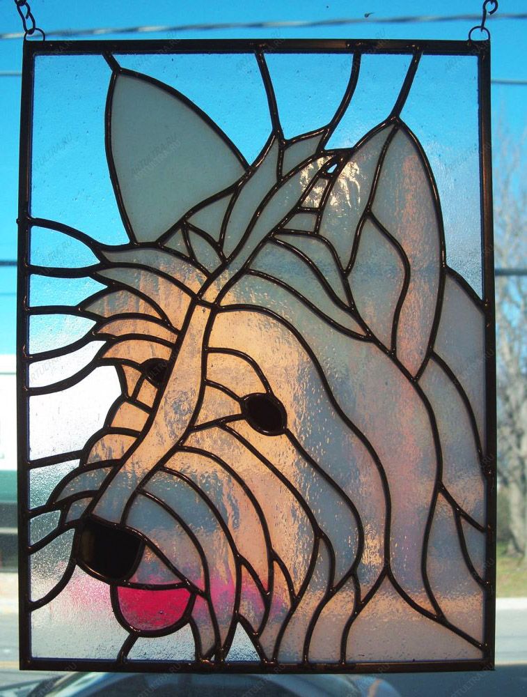 Витраж с собакой – очень забавный и оригинальный легкий декор, прекрасно поднимающий настроение и создающий в доме радостную обстановку. Он чудесно подойдет в качестве декоративного дополнения к интерьеру в детской комнате. Хотя, при желании его можно разместить и в любом другом помещении, особенно если он отлично сочетается с цветовой гаммой и стилистикой интерьера.
