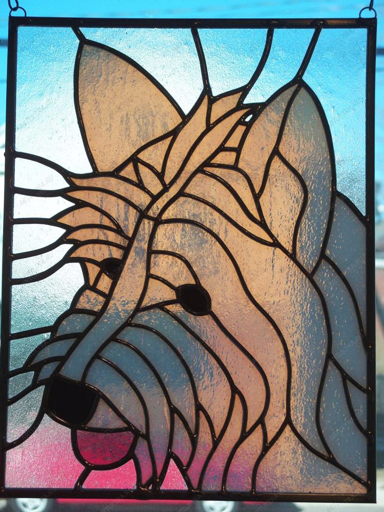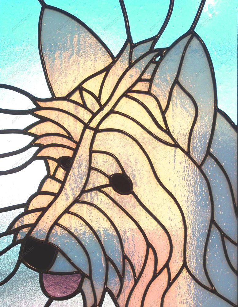 Витраж с собакой необыкновенно преобразит интерьер помещения, особенную радость он создаст в детской комнате вашего ребенка. Такой рисунок не сможет оставить равнодушным никого, будь то ребенок или взрослый человек – витраж обязательно поднимет настроение и возможно заставит улыбнуться. Изделие относится к средней категории сложности и займет на свое изготовление не менее недели.