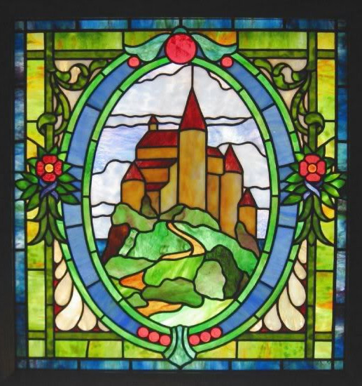 Витраж с замком – необычный сюжет, который может украсить любой предмет интерьера – дверь, окно, стеновую нишу. Этот рисунок полон спокойствия и настраивает на философское миросозерцание. Дорога, пролегающая через зеленые холмы, ведет к старинному рыцарскому замку, расположенному на высоком холме. Его многочисленные башни устремились ввысь. За замком до самой линии горизонта, простирается безмятежное море. Его воды спокойны. Только на миг, прекратили свое вечное и беспокойное движение волны, а сверху на весь этот бескрайний простор, смотрят пушистые облака. Замок не кажется, мрачным убежищем грозного феодала, а напоминает мотивы детских сказок. Именно поэтому такая композиция может использоваться при оформлении комнаты ребенка. Великолепный пейзаж обрамлен овальным орнаментом, украшенным изображением цветов.