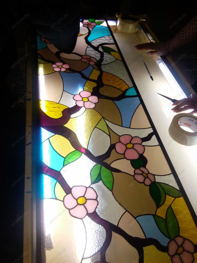 Витраж «Сакура» наделен приятными нежными оттенками красок, как мы видим на представленном фото сверху. В композиции задействовано 78 цветных стеклянных элементов. При его создании используется прочное стекло марки Spectrum. Витраж выполняется вручную: каждая деталь вырезается строго по эскизу и обтачивается особым образом стеклорезом. После этого стеклянные фракции оборачиваются медной лентой, имеющей с одной стороны клейкий слой. После того, как все детали составлены вместе, они спаиваются между собой с помощью оловянно-свинцового припоя. В результате получается единое полотно. Важную роль здесь играет тонкая контурная графика, а качественная сборка позволяет сделать композицию еще более прочной, чем цельное стеклянное полотно.