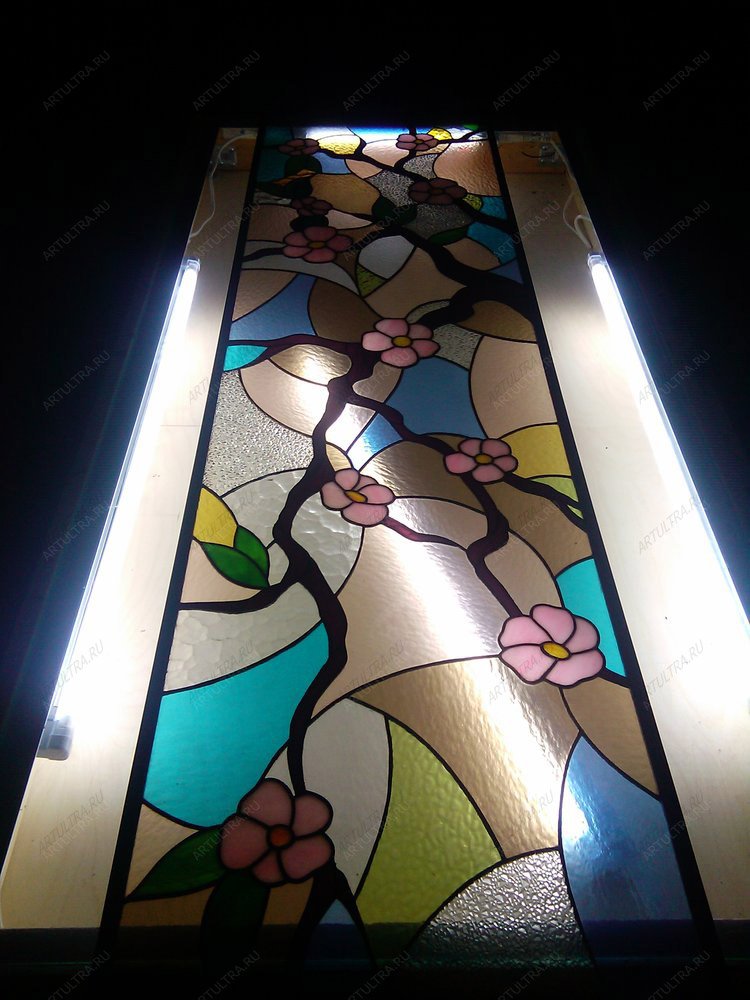 Витраж «Сакура» – оригинальное современное оформление ниши в стене, о чем свидетельствует фото выше. Выполнена данная композиция в технике Тиффани, которая независимо от времени всегда на пике популярности, поскольку с ее помощью значительно повышается качество и фактурность изображения, , а также его выразительность и реалистичность.