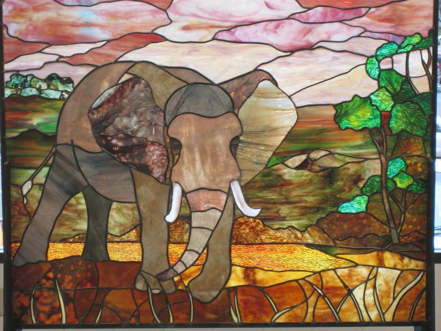 Слон является олицетворением силы, мудрости и благоразумия. В Древней Индии слон символизирует священную мудрость, непобедимую мощь и царское достоинство. Свою символику слон еще получил из-за своей причастности к одним из самых древних животных, в связи с чем, с ним и связываются такие понятия, как житейский опыт и мудрость. В нашем сознании слон воспринимается, как существо важное, уравновешенное, мудрое и склонное к размеренной жизни. Еще следует отметить, что слон очень самостоятелен и независим по своей натуре, несмотря на свою неповоротливость. Согласно вышесказанному, такой витраж оптимален для кабинета или офисного помещения.