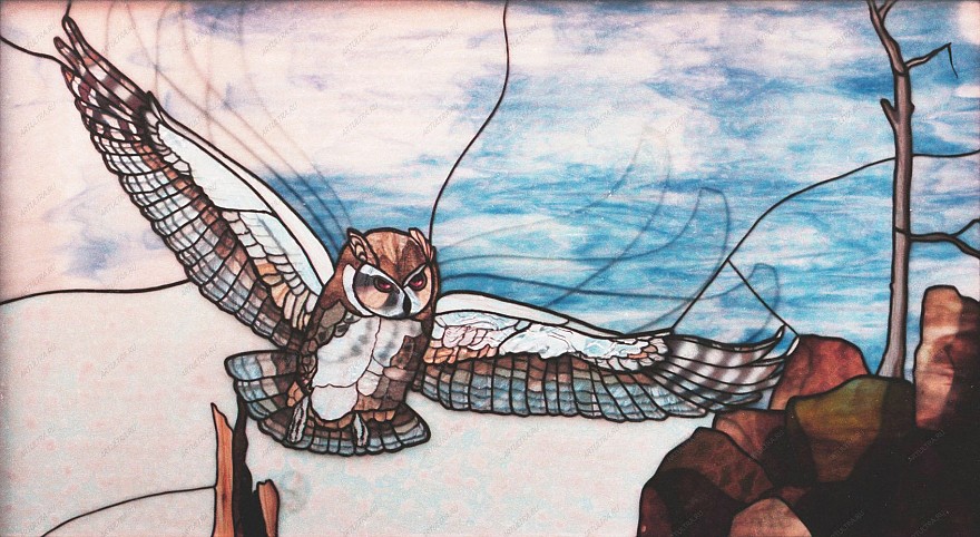 Витраж «Сова» имеет особую притягательную силу, ставя нас между реальностью и вымыслом. Это витражное панно изготовлено в технике Тиффани из стекла Spectrum и состоит из 137 деталей. Небольшие стеклышки вырезают по эскизу, обтачивают и оклеивают по контуру металлическим профилем. Далее части витража складывают в определенном порядке и спаивают оловянным припоем, который затем покрывают патиной.