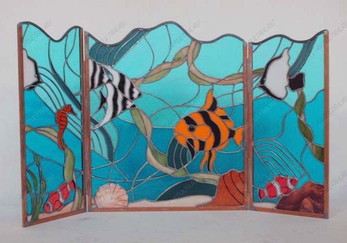 В витраже Тиффани “Морская тематика” преобладают легкие, успокаивающие тона - от бледно-голубого до цвета морской волны. На фоне нежных переливов водной глади изображены обитатели коралловых рифов, рыба-клоун, морской конек и скалярии. На дне, кроме песка и камней, нашлось место и для старого керамического кувшина, вероятно, потерянного при крушении средневекового судна, и для раковины малой жемчужницы. Листья ламинарии гармонично вписаны в общий пейзаж и слегка разбавляют собой преобладающие светло-голубые и бирюзовые оттенки. Сам пейзаж не перегружен деталями, создает ощущение легкости и умиротворения. Яркие элементы в виде рыб идеально вписаны, они не создают впечатления пестроты и придают ширме законченность.