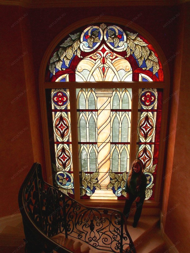 Витраж в особняке, выполненный в эффектной и популярной технике Тиффани, станет великолепным современным украшением для окон вашего коттеджа. Он придаст ему красочности, яркости, выразительности и даже величия, благодаря колонне, изображенной на витраже. Если углубиться в символику колонны, то можно обнаружить интересное толкование. Оказывается, колонна олицетворяет идею мировой оси. Имеется в виду то, что она как бы удерживает небо, связывая его с землей. Таким образом, колонна символизирует стабильность, прочное состояние, постоянство, устойчивость, силу и величие. Колонна отражает Божью идею, которая является надежной и устойчивой, в то время как человеческая - изменчива и нестабильна.