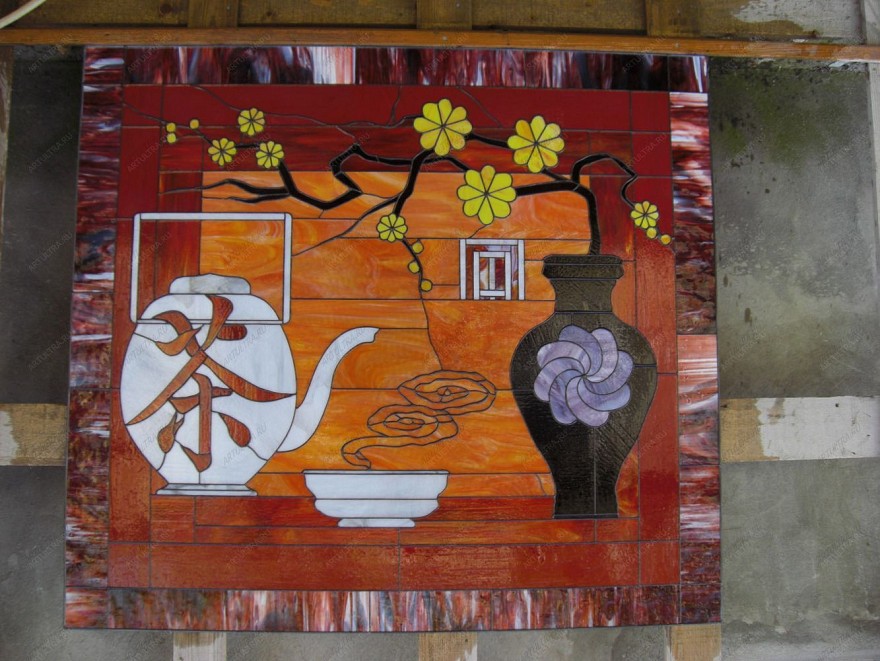 Витраж в японской технике является образцом традиционного искусства страны Восходящего Солнца. На картине изображены символы Японии — ветка сакуры и чайные принадлежности. Ветка сакуры обозначают весну — пору обновления и надежду на изменения в жизни в лучшую сторону. Японцы любят созерцать цветущую сакуру в садах. А чайная церемония в Японии имеет свой особый статус. Художник изобразил на чайнике иероглиф, который несет какую-то смысловую нагрузку. Японцы придают этому большое значение. Соединив в витраже традиционные японские символики, художник заложил в картину определенный смысл. Возможно, его можно будет понять, прочитав иероглиф.
