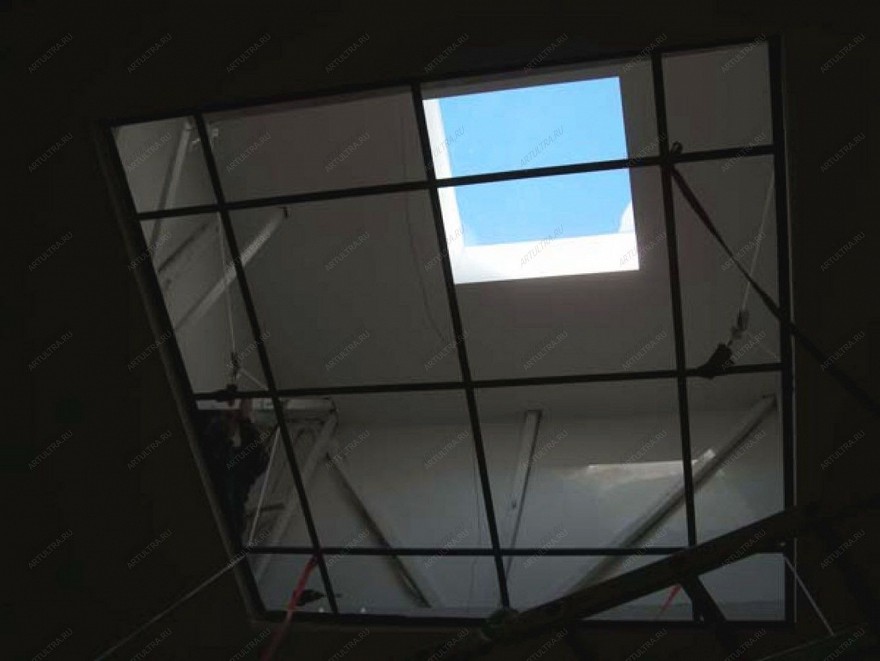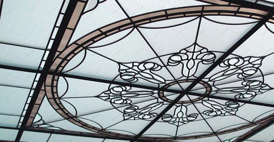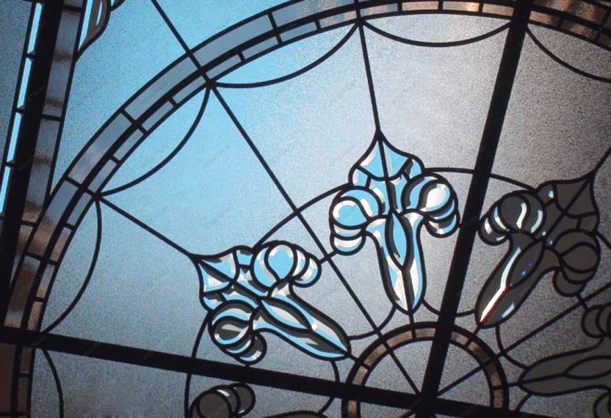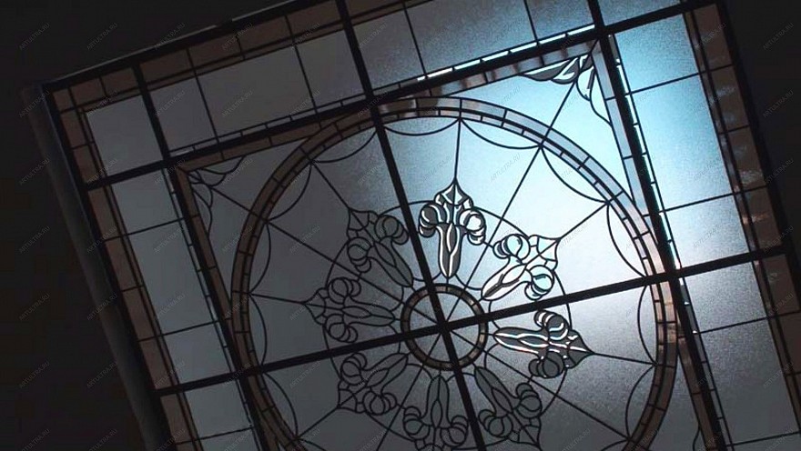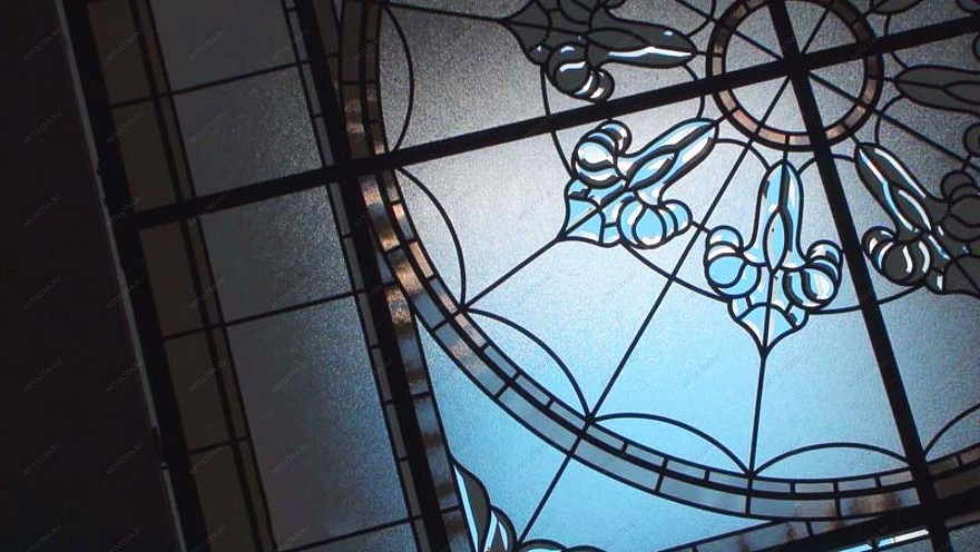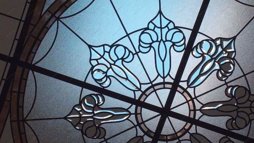 Витраж в зале на матовом стекле совмещает в себе несколько витражных техник: Тиффани с фацетированием. Матируется стекло для снижения коэффициента отражения или для того, чтобы снизить его прозрачность. Нужно отметить, что комбинированные витражи всегда смотрятся очень выигрышно и эффектно. В данном случае витражный потолок создан в технике Тиффани, с применением матированного стекла. Т.е. сперва обычное прозрачное бесцветное стекло подвергается специальной пескоструйной обработке посредством подачи на него мощного потока смеси сжатого воздуха с абразивом из кварцевого песка под высоким давлением. Таким образом, стекло становится матовым и с необычной фактурой.
