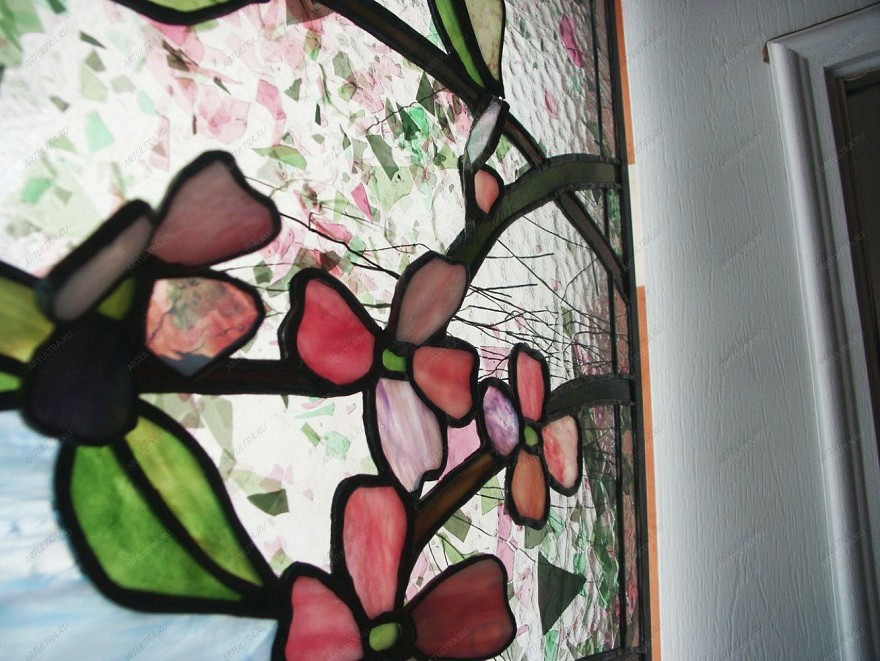 Витраж в жилом доме – современный эксклюзивный элемент декора интерьера. Такая благородная композиция выполнена в спокойных, приглушенных розовых и зеленых тонах, в связи с чем, она будет прекрасно гармонировать с любым стилем и цветовой гаммой комнаты. Таким образом можно декорировать окно комнаты или ниши. К тому же, изображение цветов, пожалуй, будет уместно в любом интерьере.