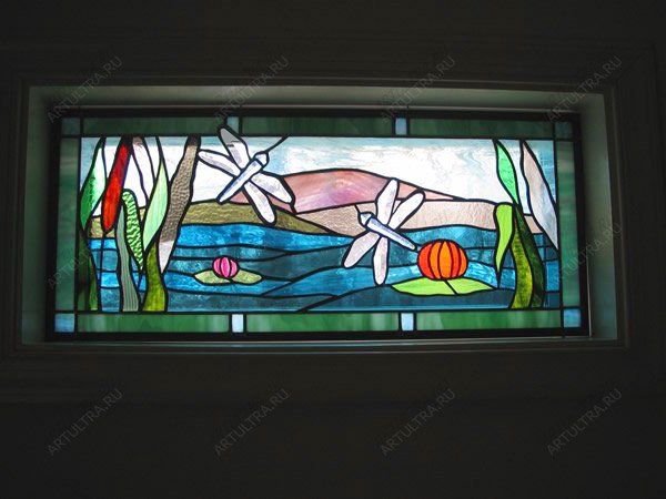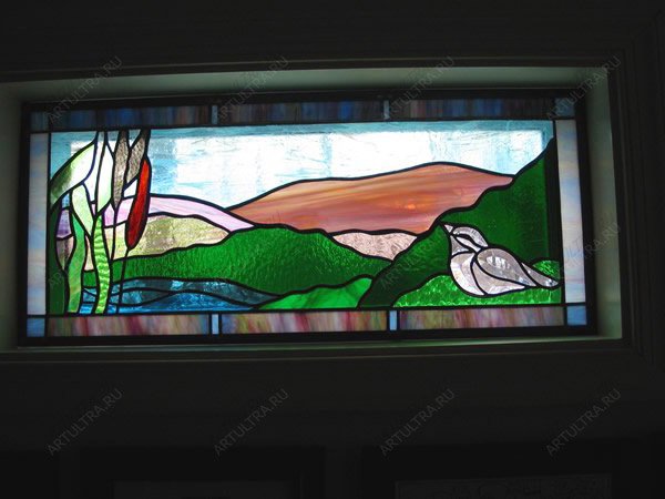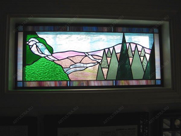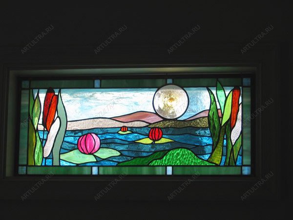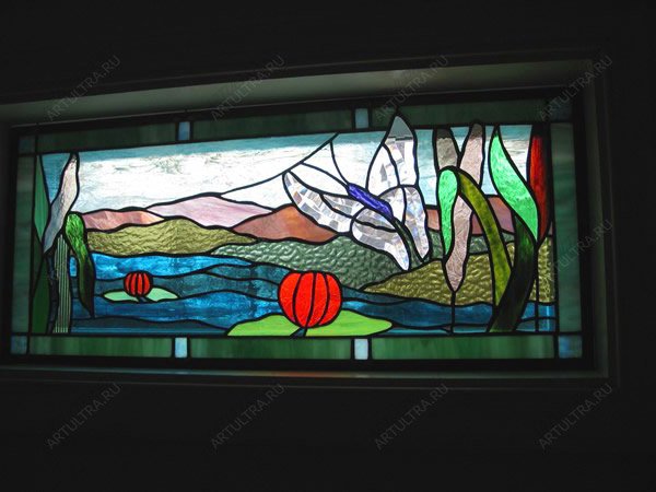 Что касается самой техники Тиффани, то она всегда имела огромную популярность, т.к. по праву считается ослепительно красивым видом витража, позволяющим взглянуть на окружающий мир через призму цветного стекла. Суть ее заключается в соединении множества кусочков цветного стекла (в данном случае их количество составляет 272 штуки) при помощи спаивания оловянно-свинцовым припоем, которые предварительно были обернуты тонкой медной лентой. При желании картины можно встраивать в абсолютно любые рамы, а в случае повреждения витража допустимо заменить только конкретные поврежденные элементы.