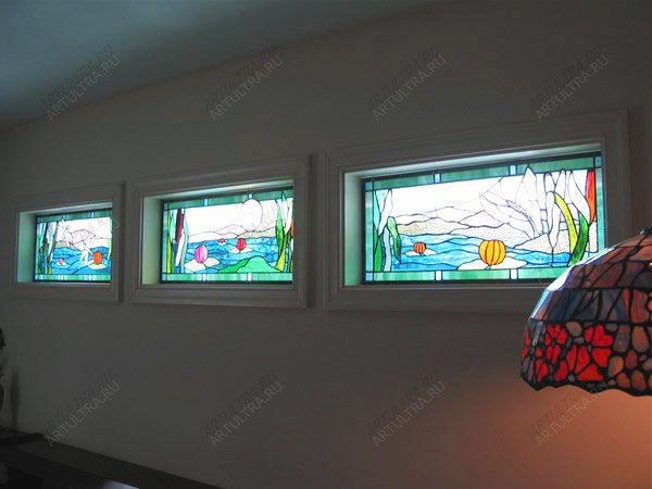 Витражные окна для спальни выполнены в технике Тиффани в стиле. Бирюзовый цвет, преобладающий в витражах, по мнению психологов, обладает успокаивающими свойствами, настраивает человека на позитив и вдохновляет на творчество. Кроме этого, бирюзовый – цвет морской свежести, чистоты и спокойствия. Стало быть, для спальни декор в такой цветовой гамме будет идеальным решением.