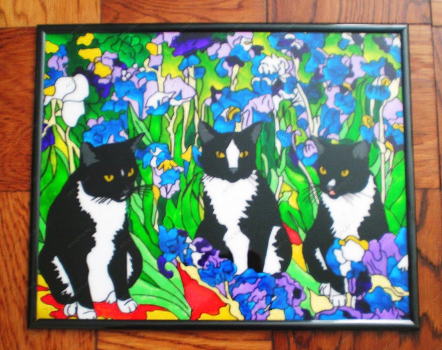 Витражи с кошками изготовлены при помощи техники фотопечати. Принцип ее заключается в том, что фотографическое полноцветное изображение наносится непосредственно на поверхность стекла. Осуществляется такая работа при помощи УФ-принтера и специальных чернил, которые затвердевают под воздействием ультрафиолетового излучения. Подобные витражи очень влагостойки, выдерживают даже резкие перепады температур, а также не боятся ультрафиолетового излучения, а значит, не выгорают на солнце. Следует отметить и тот факт, что все используемые материалы экологически чистые, безвредные и безопасные для здоровья.