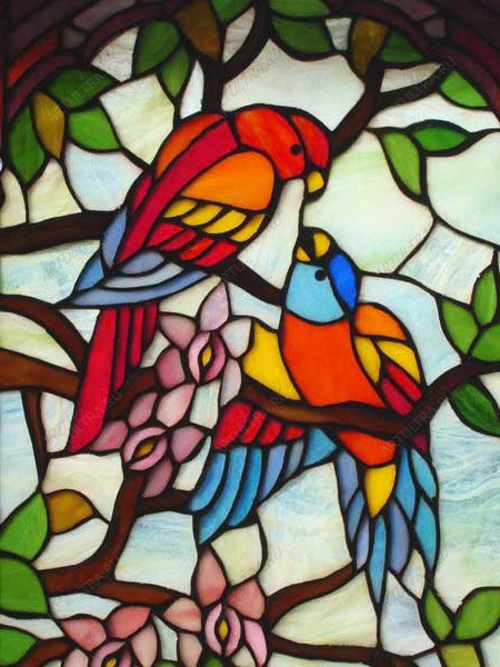 На витражах в технике Тиффани «Птицы» изображены попугайчики, являющиеся олицетворением вестников, а также посредниками между человеческим миром и миром иным. В силу способности этих птиц имитировать речь человека, их часто наделяют даром пророчества. Подобные картины можно размешать в детской комнате, гостиной, спальне или на кухне.