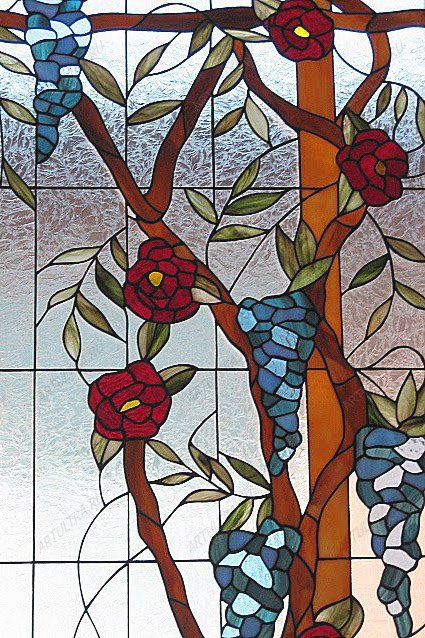 Витражи в арках двери созданы при помощи техники пленочного витража, в которой используется специальная самоклеющаяся пленка. Она бывает фактурная, гладкая, с рисунком и без него, а также может обладать разной степенью прозрачности. Пленка наклеивается на бесцветное стекло-основу, а стыки проклеиваются самоклеющейся свинцовой лентой шириной от 3 до 6 мм. Таким образом, пленочный витраж – это «псевдовитраж», имитирующий сложные наборные техники. В связи с этим, стоимость на его изготовление более демократичная по сравнению с настоящим витражом. Выбор пленок на сегодняшний день достаточно широкий, однако, все же уступает разнообразию настоящих витражных стекол. Пленочный витраж не выцветает, но в плане устойчивости к механическим повреждениям не может конкурировать с витражным стеклом. В связи с этим, нежелательно использование пленочного витража в помещениях с повышенной влажностью или температурой, а также в местах, где есть шанс поцарапать декоративную пленку.