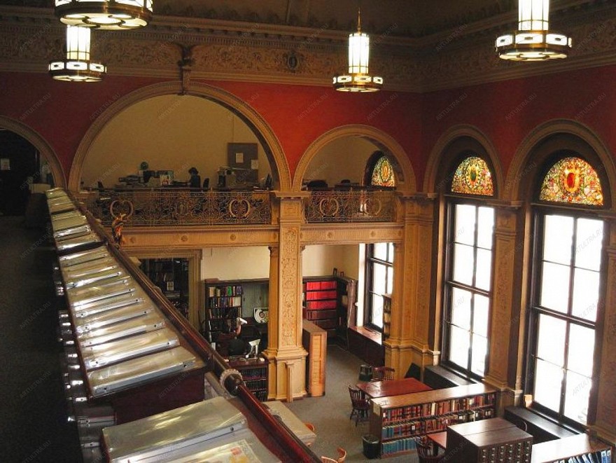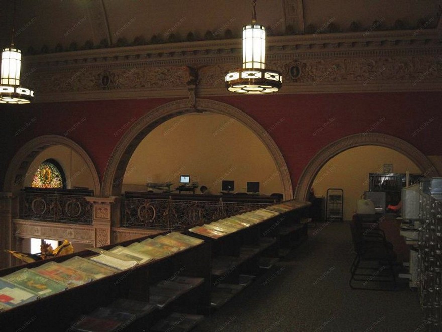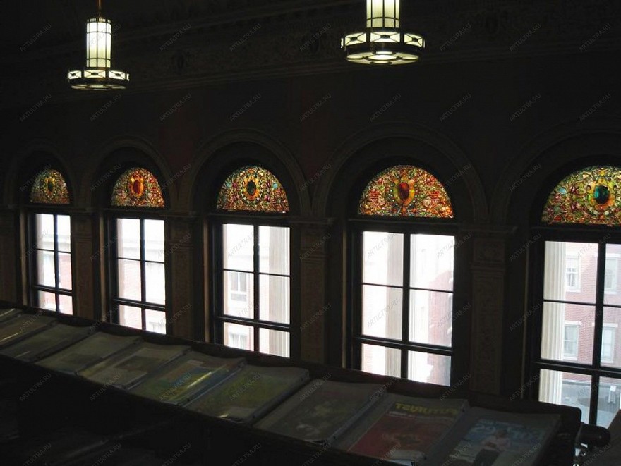 Техника Тиффани, в которой выполнены витражи в библиотеке, уже давно смогла завоевать популярность в связи со своим высоким художественным уровнем создаваемых изделий. Тонкость и изящество витражей делает их подобными расписным стеклам. Кусочкам стекла, количество которых в данном изделии составляет 2086 штук, сначала придается нужная форма в строгом соответствии с разработанным эскизом. После этого их плотно обтягивают по краям медной лентой, а далее они выкладываются в нужной последовательности, образуя рисунок, согласно эскизу. После сегменты скрепляются между собой с обеих сторон при помощи оловянно-свинцового припоя. При этом, чтобы не очень приглядным оловянным стыкам придать более эстетичный вид, их покрывают черной или медной патиной. Обычно линии пайки имеют разную толщину, что добавляют витражу пластичность и выразительность, а также подчеркивает рукотворность данной работы.