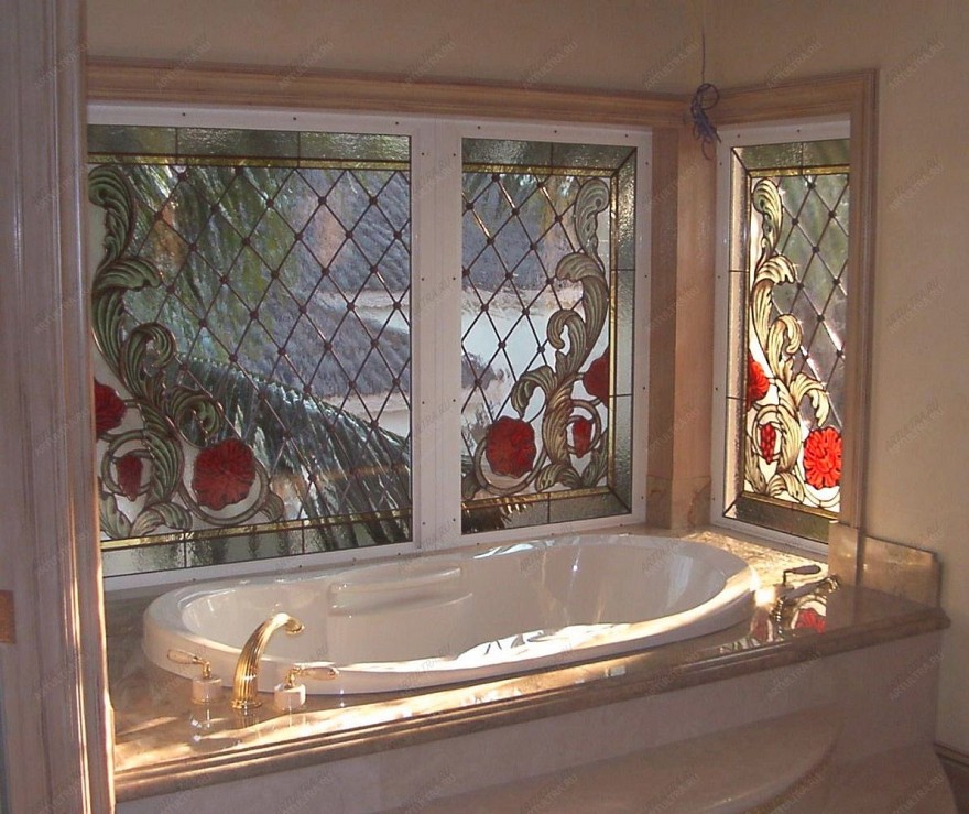 Кроме всего прочего, с использованием витражей в ванную комнату, появляется чудесная возможность скрыть некоторые строительные огрехи, завуалировать прозрачность стекла в окне, нанеся на него прекрасный романтический рисунок, создав в помещении атмосферу уюта и безупречного комфорта.