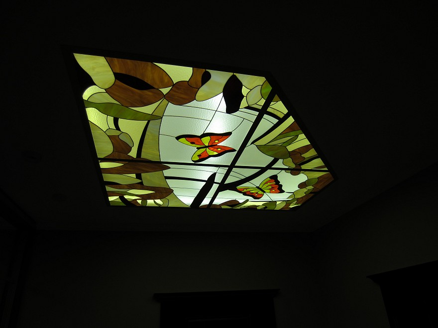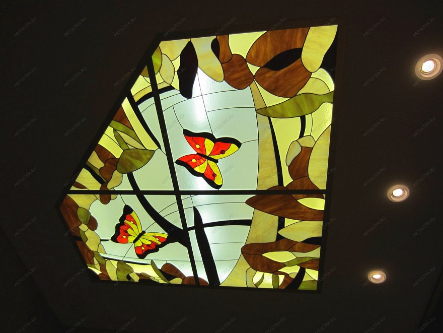 Витражные бабочки, украшающие потолок, удивительно преобразят любую комнату и сделают ее по-летнему яркой и теплой. Витражные потолки - это целое искусство, которое пришло в наши дни из глубины веков. Композиция собрана в технике Тиффани, которая является ведущей в мире витражей. Почти двести деталей соединены при помощи ленты из меди и оловянного припоя, за счет этого изделие обладает особой прочностью и надежностью. Этот удивительный способ сборки позволяет добиться шикарного эффекта реальности и живости картины, а роскошные переливы цвета не позволят отвести от нее глаз.