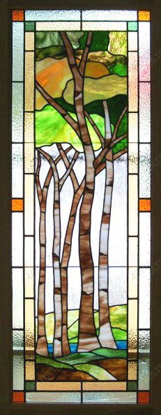 Витражные березы собираются из 86 цветных стеклянных элементов прочного стекла марки Spectrum, пропаянных между собой при помощи оловянно-свинцового припоя, предварительно обернутых медной лентой. Работа относится к средней категории сложности и на свое изготовление требует от мастеров срока не менее трех недель. Предоставляемая гарантия на изделие составляет 12 лет. Но если не использовать при очистке витража абразивных средств, изделие прослужит вам гораздо дольше указанного срока.