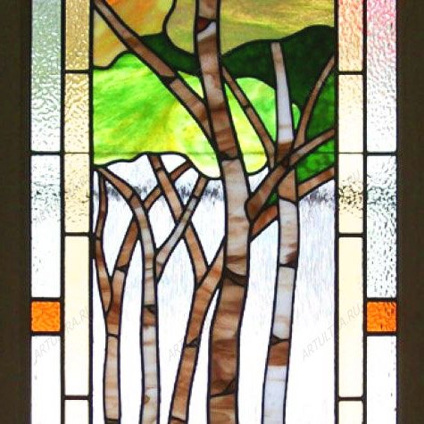 Витражные березы, выполненные в популярнейшей технике Тиффани в стиле «пейзажи в интерьере», станут замечательным современным украшением для вашего окна. Подойдет такой декор для любого помещения, в каком бы стиле оно не было выполнено. Тема природы очень универсальна и совершенно не обязывающая. Наоборот, ваш интерьер мгновенно приобретет завершенный вид.