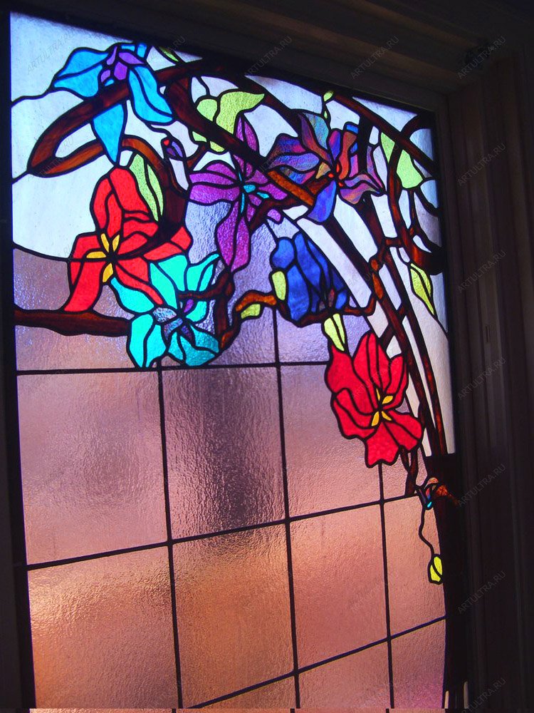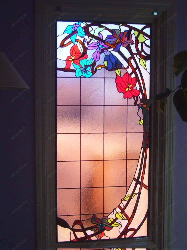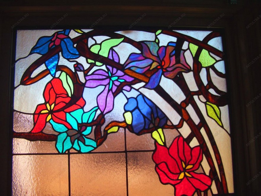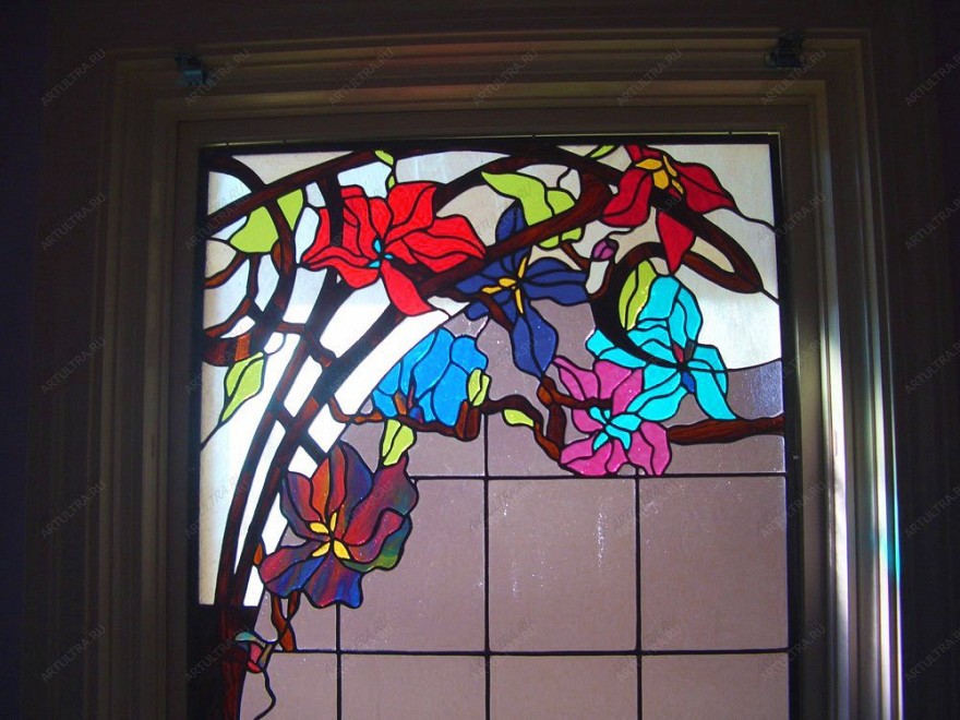 Витражные цветы – это универсальный декор для любого помещения, так как цветы всегда считались самым удобным вариантом для украшения чего-либо. Техника Тиффани, которая использовалась для создания витража, позволила сделать его невероятно красивым и роскошным. Волшебные переливы цвета и полная реалистичность были достигнуты при помощи особой пайки и медной ленты, которые удерживают 96 элементов в единой композиции. Каждая деталь прошла огранку стеклорезом для более точного соединения, поэтому брак полностью исключен. Украсив таким образом межкомнатную дверь, вы добьетесь потрясающего эффекта разграниченности пространства и удивительной нежной красоты.