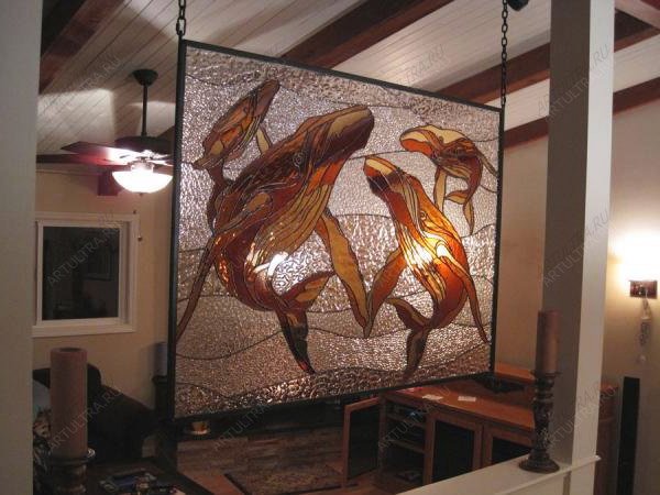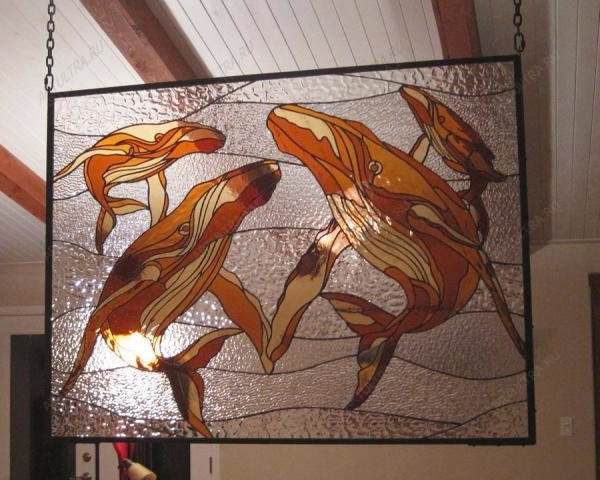 Витражные киты станут необычным современным эффектным украшением вашего жилища. Они подчеркнут всю вашу эксклюзивность и непохожесть, прекрасно дополнят дизайн, создав в доме теплую и комфортную обстановку. Разместить такую композицию можно не только в квартире, но, например, в ресторане или кафе.