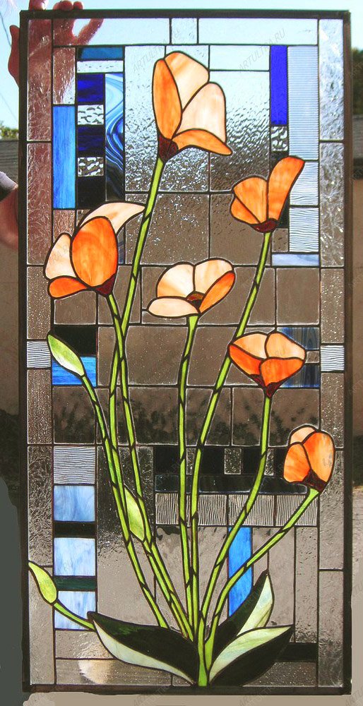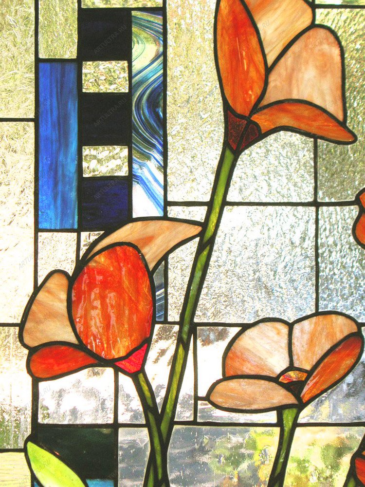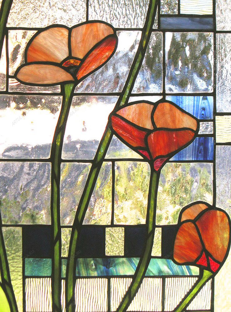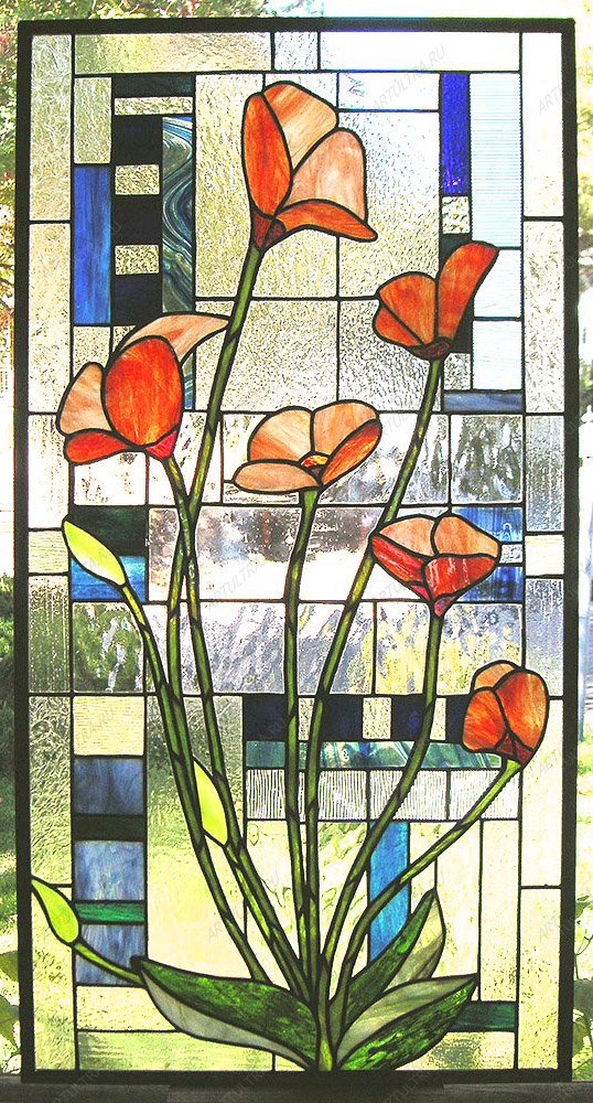 Алые витражные маки на фоне прозрачного неба и зеленого луга поселят в вашем доме умиротворение и тишину полуденного зноя. Такое окно идеально подойдет и для спальни, и для гостиной, и для детской, и даже для кухни, так как рисунок нежных цветов всегда уместен. Качественные материалы от известного производителя гарантируют полную безопасность для здоровья и надежность изделия. Картина не боится солнца и влаги, поэтому краски долго останутся яркими, и изделие прослужит дольше заявленного срока в 12 лет. Помимо красоты, витражные маки способны наделить дом уникальной атмосферой силы духа и богатства, так как они всегда символизировали стойкость и плодородие.