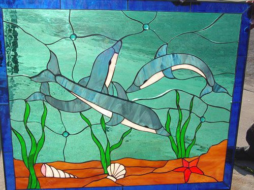 Витражные морские обитатели: дельфины, морская звезда, моллюски и листья водорослей. В целом пейзаж сбалансирован как по цвету, так и по элементам. Теплая цветовая гамма рисунка формируется за счет стекла цвета охры, которое применялось для воссоздания дна, и бирюзового прозрачного стекла, использованного для передачи фактуры воды. Вместе эти оттенки создают гармоничное цветовое решение картины. В центре пейзажа три дельфина – символ доброты, надежды, любви и дружбы. Благодаря этому, данный витраж способствует созданию благоприятной психологической атмосферы в помещении.