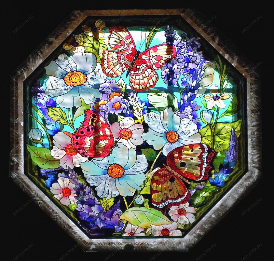 Витражные рисунки с бабочками, хороши тем, что довольно надежны и легки в уходе: их протирают неагрессивными составами и мягкими тряпками. Считается, что изображение цветов и бабочек приносят в дом счастье и удачу, поэтому помимо эстетики, такое окно станет талисманом для вашей семьи.