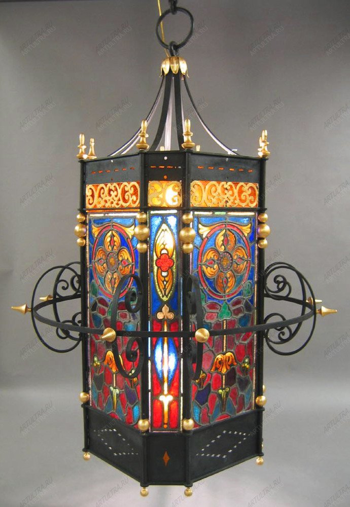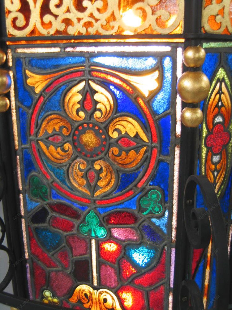 Поверхность витражного фонаря украшает орнамент по восточным мотивам, считается, что именно такой стиль сочетается с любым интерьером, не вступая в конфликт. Огранка угольно-черного цвета красиво оттеняет яркие краски узора, поэтому фонарь выглядит роскошно и дорого. Мастер использовал материалы, предоставленные известным производителем, поэтому вещь можно назвать высококлассной, долговечной, и экологически чистой. Такой фонарь украсит прихожую, террасу, гостиную и даже детскую комнату в качестве источника дополнительного освещения.