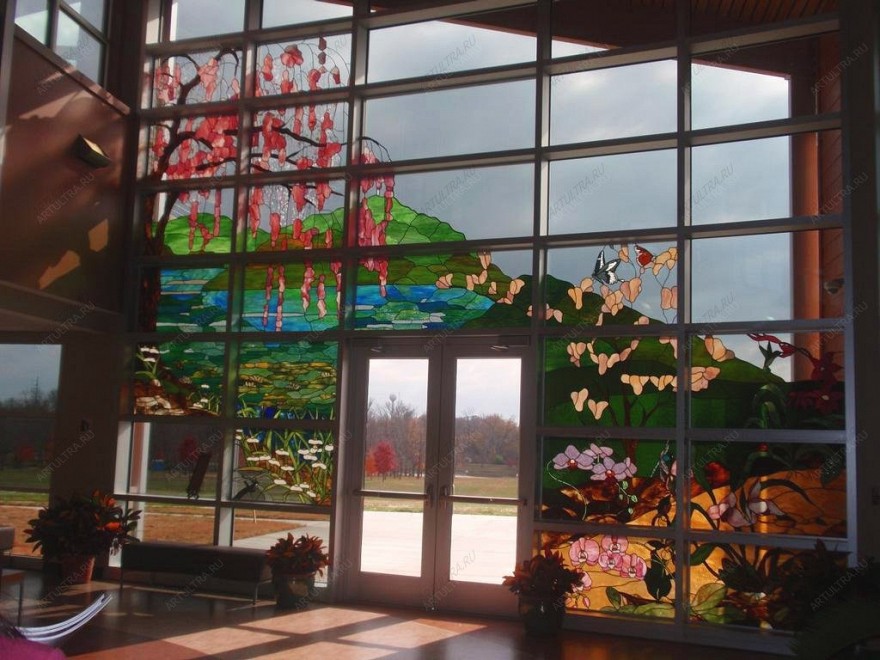 Витражный пейзаж послужит эксклюзивным декором для оформления входной группы, способным стать необычайно ярким и значимым элементом в ее дизайне. Декорированная таким образом конструкция входной группы станет эффектным украшением как фасада здания, так и интерьера. Необыкновенно красочное и впечатляющее изображение пейзажа будет сразу привлекать к себе внимание своим великолепием. Это поистине эксклюзивный декор с многообразием зелени и цветов.