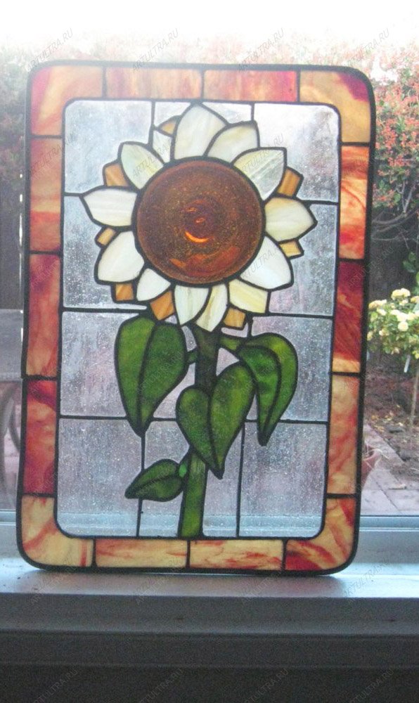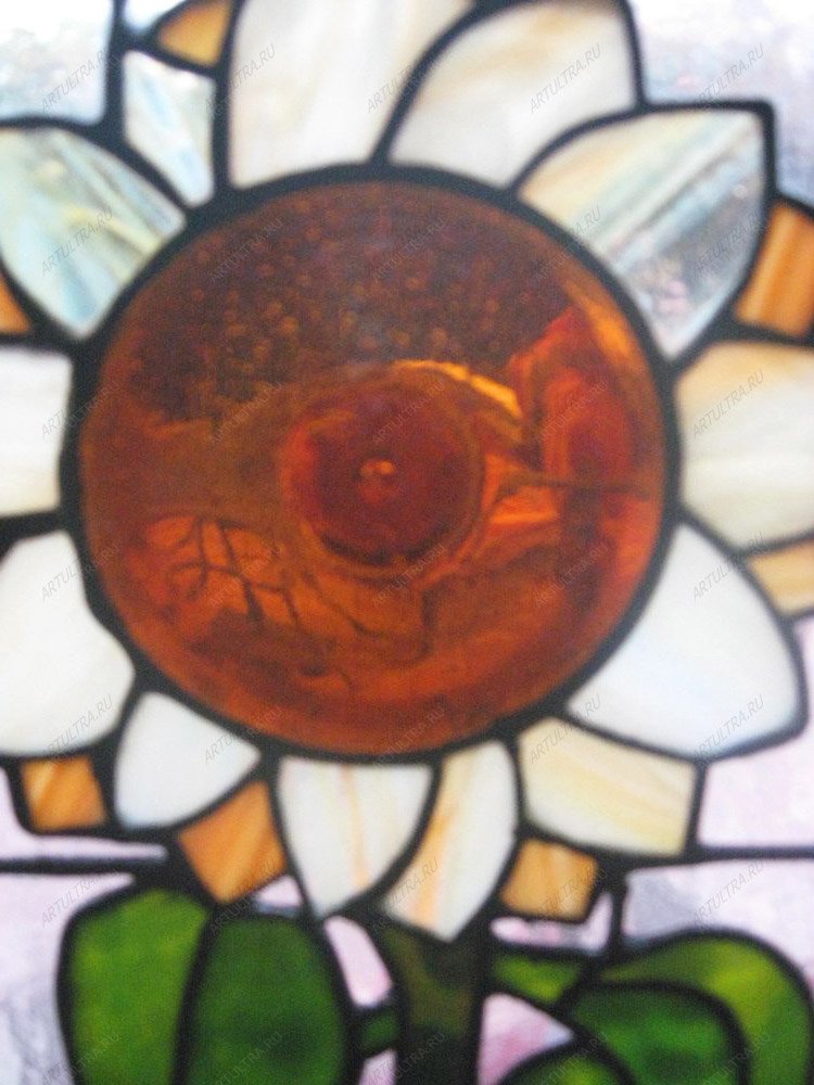 Золотисто-оранжевая серединка цветка в обрамлении молочно-белых и желтых лепестков на изумрудном стебле сразу создает впечатление солнечного тепла, которое исходит от изображения. При ярком свете от картины исходит мистическое сияние, которое делает цветок удивительно реальным. Прозрачный фон создает эффект невесомости композиции и позволяет совмещать ее с любой обстановкой. Витражный подсолнух будет уместен в спальне, в детской, в кабинете, гостиной или на кухне. Универсальный классический стиль и теплая цветовая гамма позволяют поместить картину в любой интерьер.