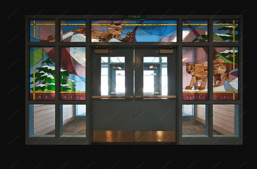 Относительно изображенных в композиции кошек, можно отметить, что они являются воплощением грациозности, красоты, независимости, а также ловкости и неуязвимости, ведь кошка всегда способна приземляться на лапы, отличаясь своей необыкновенной живучестью. Уход за витражным тамбуром производится при помощи влажной тряпочки, смоченной в средстве для мытья стекол. Не рекомендуется применять сухие чистящие порошки, а также растворители. Гарантия такого витража на входной группе составляет 12 лет.